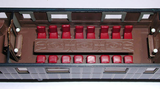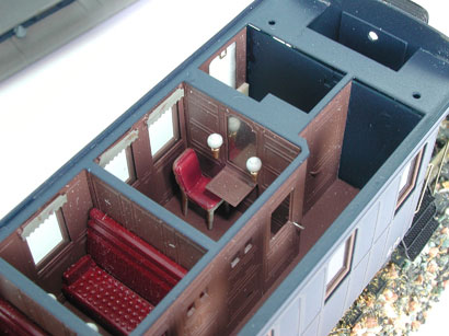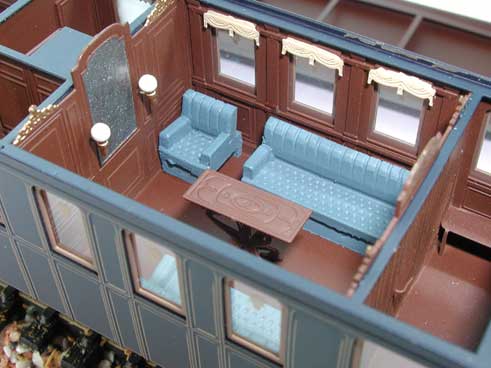 Il salotto completo di arredi i lampadari a parete e a soffitto sono con la riproduzione della zona notte e dei scompartimenti per i dignitari del seguito, la parte caratteristica della carrozza. Uno scompartimento dotato di strapuntini per i Corazzieri della scorta completa il modello. La cassa , accuratamente verniciata nel tradizionale “blu notte” e decorata con filetti in oro tampografati, il telaio in nero e il tetto in grigio, fanno di questo modello un’altra straordinaria ricostruzione storica.