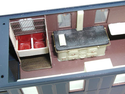 La cucina funzionante a carbon coke venne mantenuta inalterata. Le brande di servizio, in numero di tre, vennero modificate e rese piu’ confortevoli per il personale addetto che le occupava, finito il servizio, estraendole dalle loro custodie. Le ghiacciaie vennero spostate sul bagagliaio adibito a dispensa. Come tutte le carrozze del prestigioso convoglio, la carrozza Cucina e’ caratterizzata da tetto asportabile e illuminazione interna per apprezzare i pannelli di rivestimento, i tendaggi, gli arredi riprodotti in ogni minimo dettaglio. La cucina, completa di stufa con piastre in ghisa, lavello in rame, piani di lavoro, armadi dispensa e pensili, e’ la riproduzione degli scompartimenti per gli ufficiali di scorta , la parte caratteristica di questa riproduzione. Un corridoio di servizio e la ritirata completano questa carrozza. La cassa , accuratamente verniciata nel tradizionale “blu notte” e decorata con filetti in oro tampografati, il telaio in nero e il tetto in grigio, fanno di questo modello un’altra straordinaria ricostruzione storica.