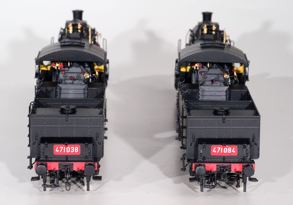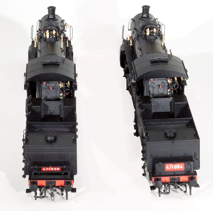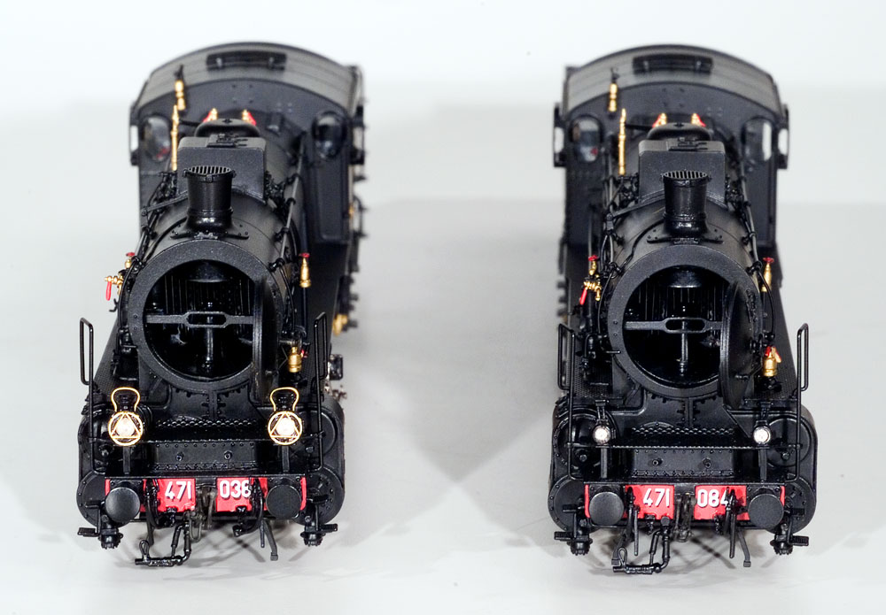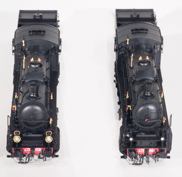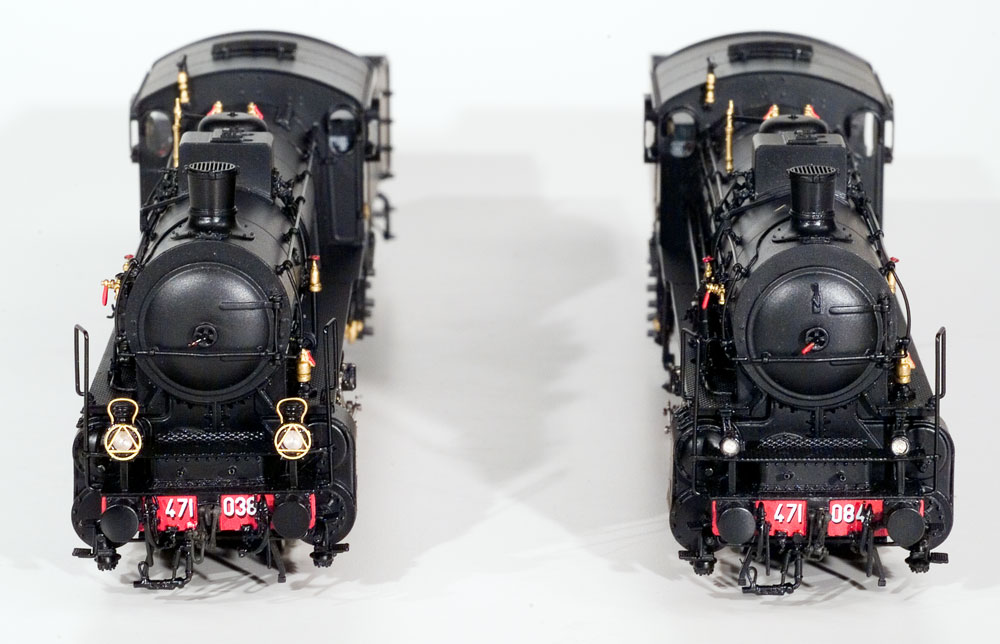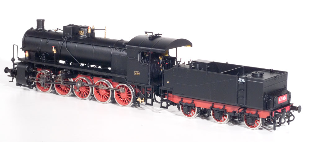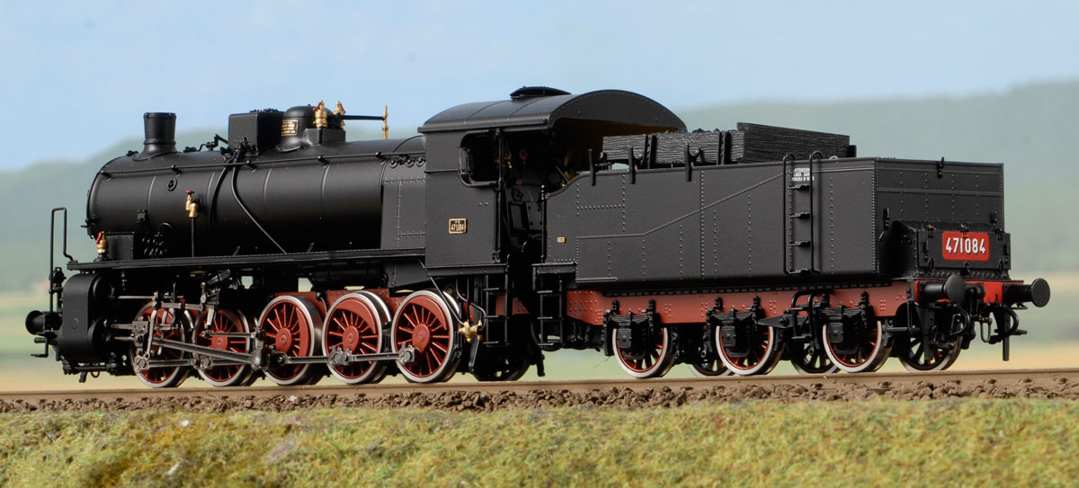 FS Gr. 471.084 con cabina standard. Fanali tipo elettrici, tender acqua a tre assi con serbatoio da 20 mc , targhe nere. Portellone camera a fumo, boccaporti acqua e cassetta degli attrezzi sul tender apribili. Colore nero / rosso, stato anni ’60 Officine Ernesto Breda , Milano