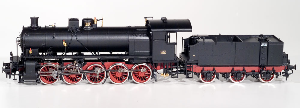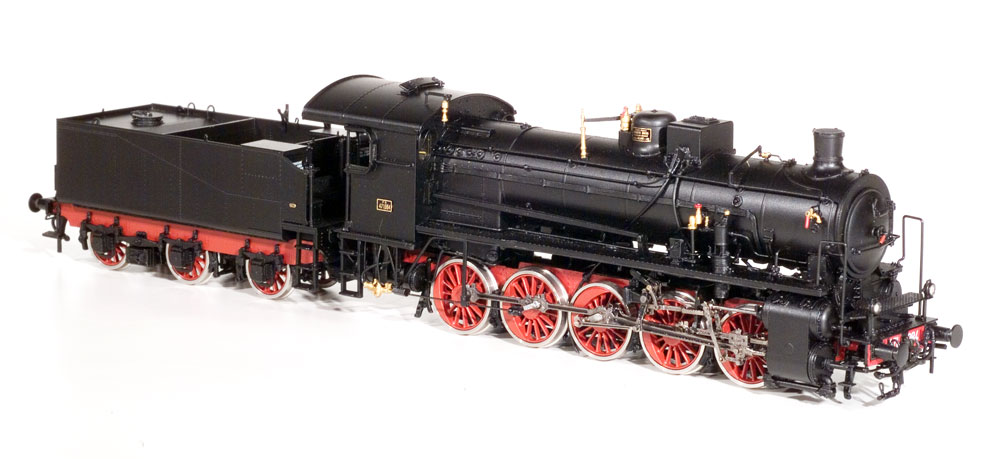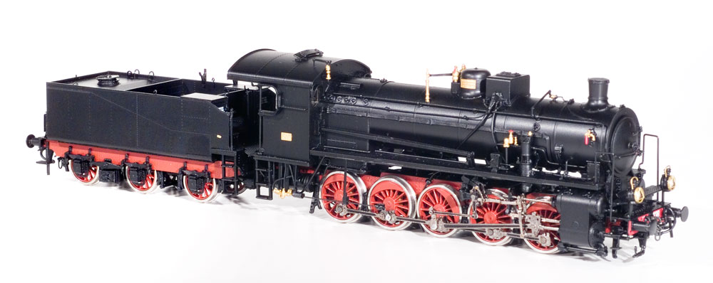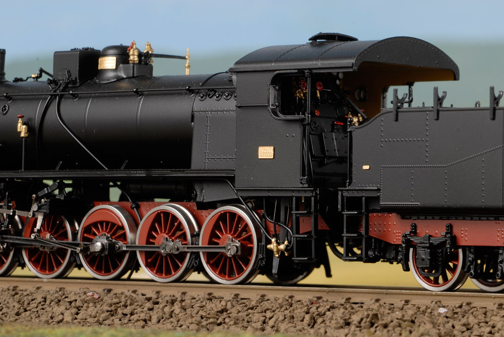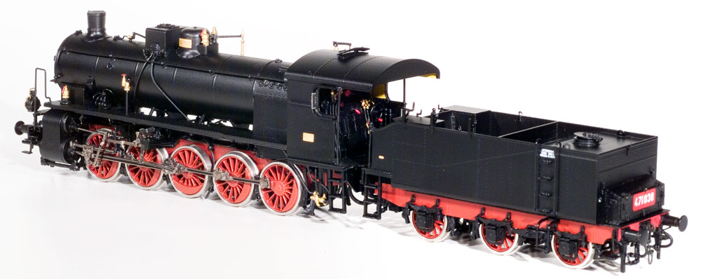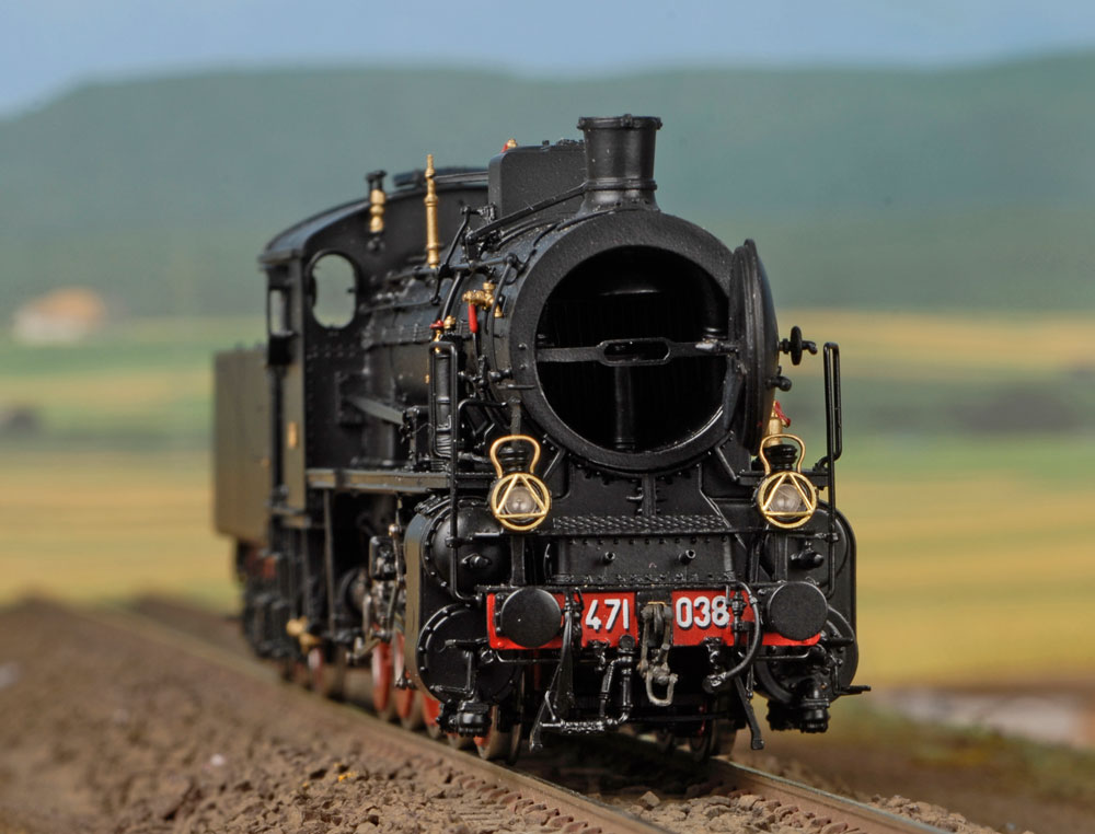 FS Gr. 471.038 con cabina standard. Fanali tipo ad olio, tender acqua a tre assi con serbatoio da 20 mc , targhe in bronzo. Portellone camera a fumo, boccaporti acqua e cassetta degli attrezzi sul tender apribili. Colore nero / rosso, stato anni ’50 Officine Meccaniche di Milano - OM