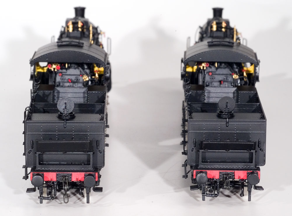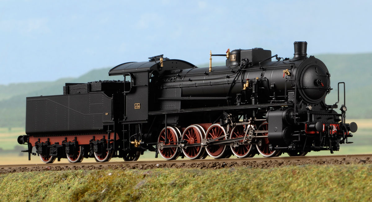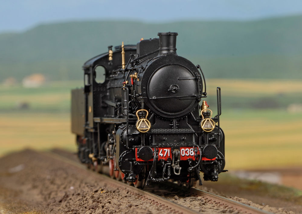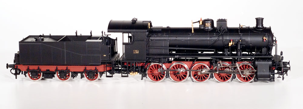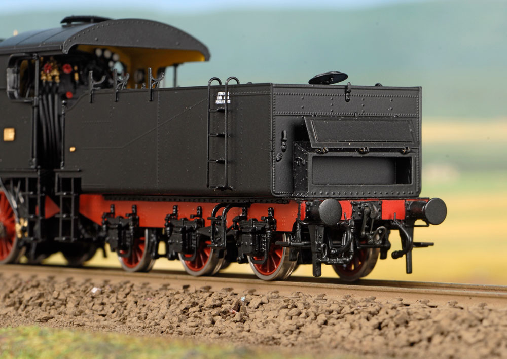 FS Gr. 471.038 con cabina standard. Fanali tipo ad olio, tender acqua a tre assi con serbatoio da 20 mc , targhe in bronzo. Portellone camera a fumo, boccaporti acqua e cassetta degli attrezzi sul tender apribili. Colore nero / rosso, stato anni ’50 Officine Meccaniche di Milano - OM