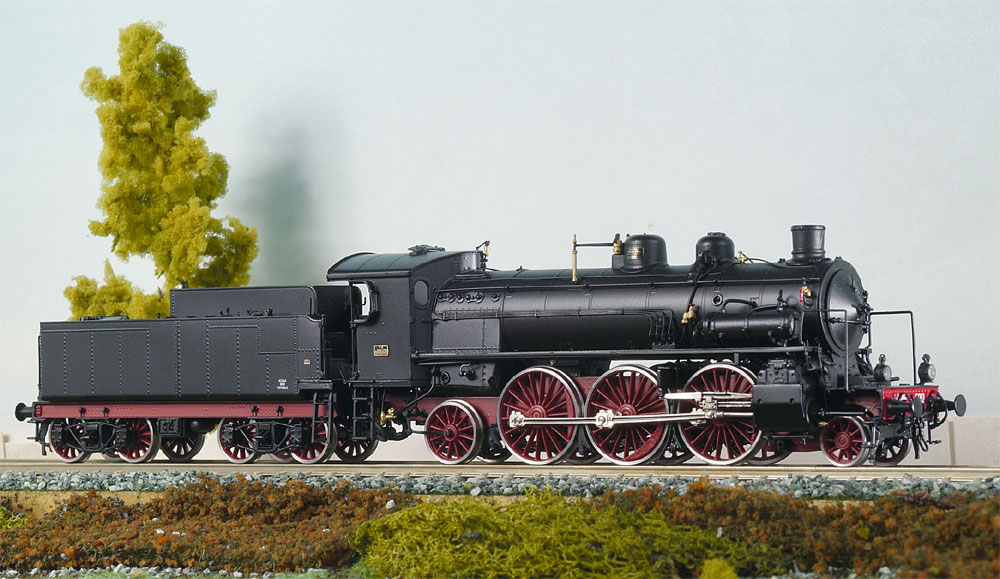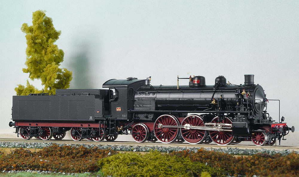 Locomotiva di prima ordinazione. Pompe sul lato sx e preriscaldatore sul lato dx. tender a carrelli da 22 mc, tipo 2'2'T22.